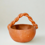 Recipiente cerâmico com alça trançada, inspirado nos gestos dos transporte e da coleta. Uma peça que simboliza deslocamento, sustento e continuidade.